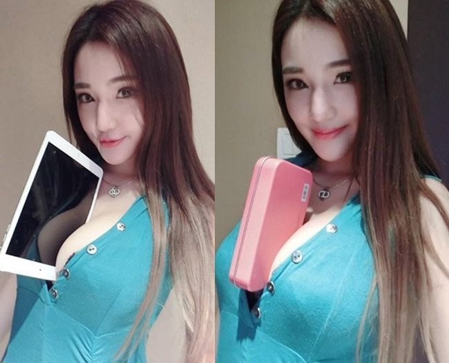Gu Jing Jing từng gây sốc khi dùng ngực để kẹp điện thoại, ipad và một số đồ vật khác.