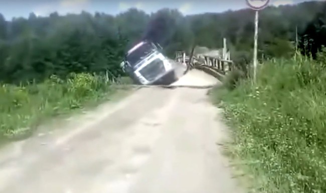 Kênh RT (Nga) cho biết trước cây cầu có biển giao thông cảnh báo không chống đỡ được phương tiện có tải trọng hơn 3 tấn. Tuy nhiên, người lái xe tải dường như không quan tâm tới thực tế này và cố vượt qua cầu (video dưới, nguồn: RT).