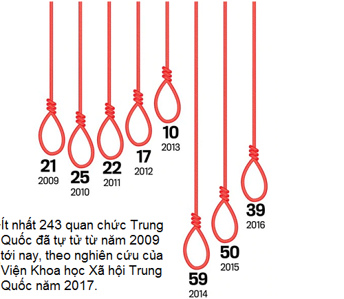 Trong một báo cáo xuất bản năm 2017 của Viện Khoa học Xã hội Trung Quốc (CASS), từ năm 2009 tới 2016 có tới 243 quan chức tự tử. Trong đó cao nhất là năm 2014 với 59 trường hợp, theo Caixin.