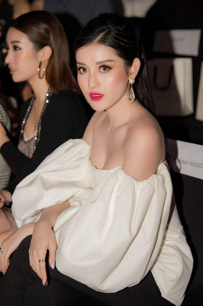 Huyền My mặc áo trễ vai cùng quần ống vẩy đi xem thời trang