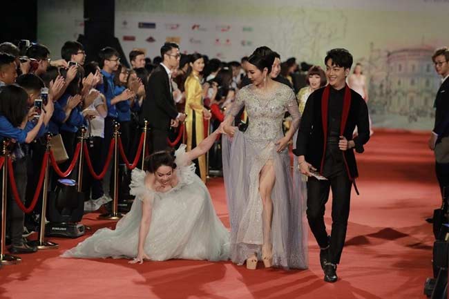 Nhưng vì quá rườm rà khiến cho cô gặp "tai nạn" khi ngã ngay trên sân khấu thảm đỏ.