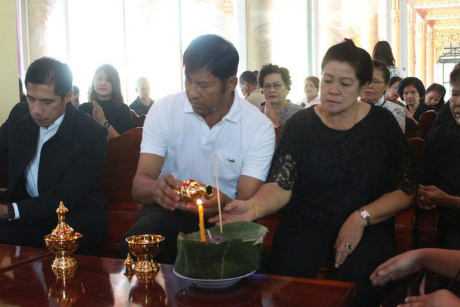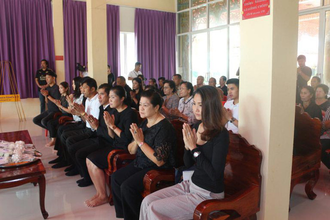 Trong buổi lễ, bố của Nursara Suknamai (áo trắng-pv) chia sẻ với truyền thông: "Hai ngày trước khi xảy ra vụ nổ trực thăng bên ngoài sân King Power, tôi luôn cảm thấy bất an. Khi ngủ, tôi nghe thấy tiếng các nhà sư tụng kinh văng vẳng bên tai.