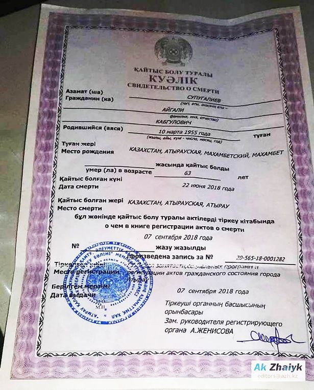 Giấy chứng tử của ông Aigali do cơ quan địa phương cung cấp.