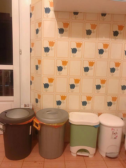 Nhà chị Trần Tuyết ở Italy có 4 chiếc thùng để đựng 4 loại rác khác nhau: Nhựa, giấy, chai lọ thủy tinh và đồ hữu cơ.