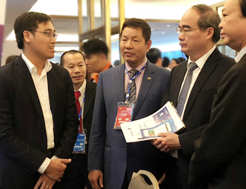 Bí thư Thành ủy TP HCM Nguyễn Thiện Nhân (thứ hai, bên phải) nói chuyện với các nhà sáng tạo trẻ về đề án thành phố thông minh. Ảnh: Tuyết Nguyễn.