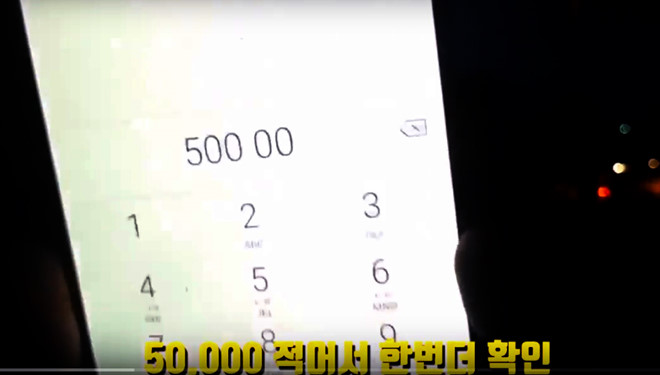 Anh Park Sung Eun gõ số tiền 50.000 đồng lên điện thoại và được người lái xích lô đồng ý. Ảnh cắt từ clip.