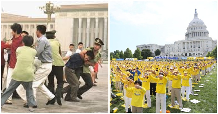 Sự tương phản giữa Trung Quốc và Hoa Kỳ, nhìn từ cuộc đàn áp Pháp Luân Công: Ảnh bên trái là công an Trung Quốc bắt bớ các học viên Pháp Luân Công tại quảng trường Thiên An Môn. Ảnh bên phải là hàng ngàn học viên Pháp Luân Công từ nhiều quốc gia tập luyện bên cạnh tòa nhà Nghị viện Hoa Kỳ, thủ đô Washington (Ảnh: Fofg/Minghui)