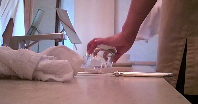 Trong video, nữ dọn phòng nhặt một chiếc khăn bẩn từ sàn nhà và dùng nó để lau cốc, gương, kính nhà tắm. Một nhân viên khác sử dụng khăn bẩn để lau cốc uống cà phê.