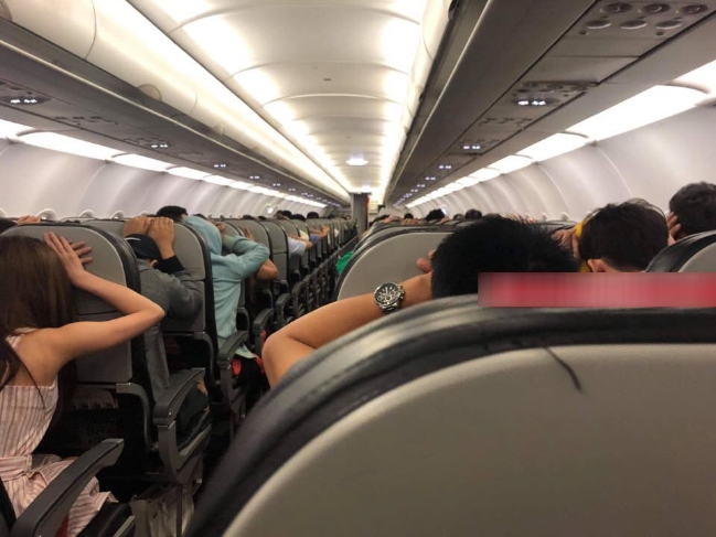 Ảnh: Tất cả khách trên chuyến VJ198 đang thực hiện tư thế bám chặt vào ghế, chuẩn bị trước tình huống xấu xảy ra.