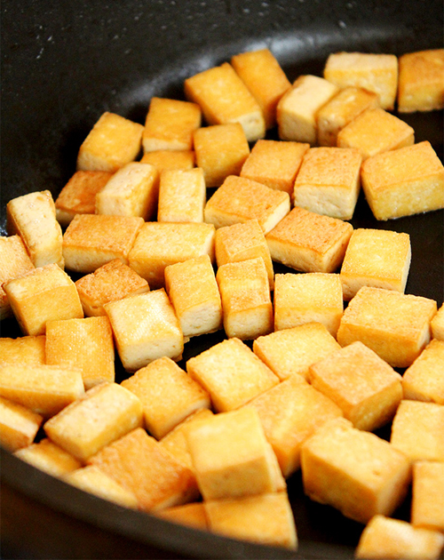 - Cắt đậu thành từng khối nhỏ vừa ăn rồi chiên trong dầu.
