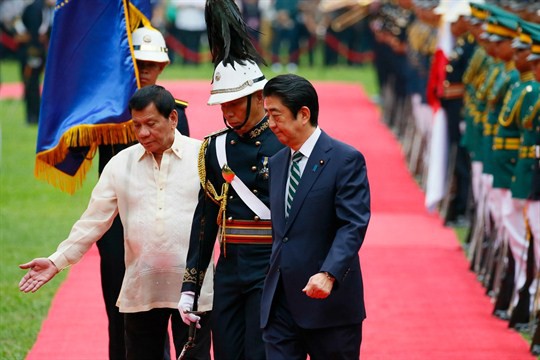 Điều này khác biệt với hình ảnh trong chuyến thăm Philippines của Thủ tướng Nhật Bản Shinzo Abe trước đó - Quốc kỳ Nhật Bản không được mang theo sau hai nhà lãnh đạo.