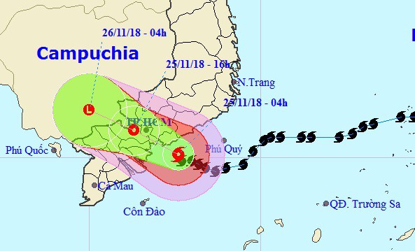 Thông tin mới nhất, vị trí tâm bão lúc 07h ngày 25/11 khoảng 10,20N; 107,40E, cách Vũng Tàu khoảng 30km, cách Bến Tre 95km. Sức gió mạnh nhất: cấp 9 (75-90km/h), giật cấp 12. Trong 3 giờ tới, bão di chuyển hướng Tây Tây Bắc, tốc độ 5Km/h, hướng đến Vũng Tàu-Bến Tre.