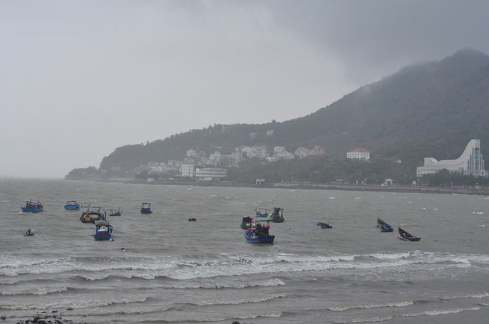 Bãi Sau, đường Thùy Vân (TP Vũng Tàu) lúc 7 giờ sáng 25-11, mịt mù mưa, gió bắt đầu mạnh. Trong khi đó, ở Bãi Trước, bến tàu cánh ngầm sóng trắng xóa.
