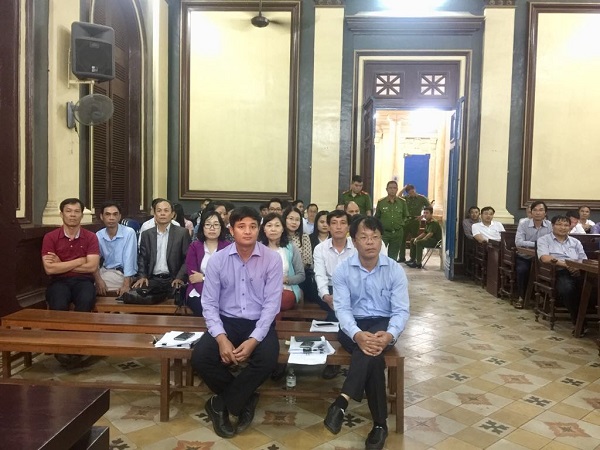 Các bị cáo tự tin tại phiên tòa ngày 26/11. (Hàng đầu, Đinh Văn Quyết bên trái ảnh và Vũ Văn Đảo)