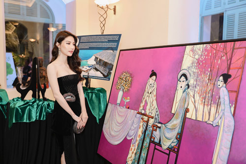 Diễm My 9x là một trong những nghệ sỹ đến từ sớm, cô tham quan các bức tranh, vật phẩm chuẩn bị cho buổi đấu giá.
