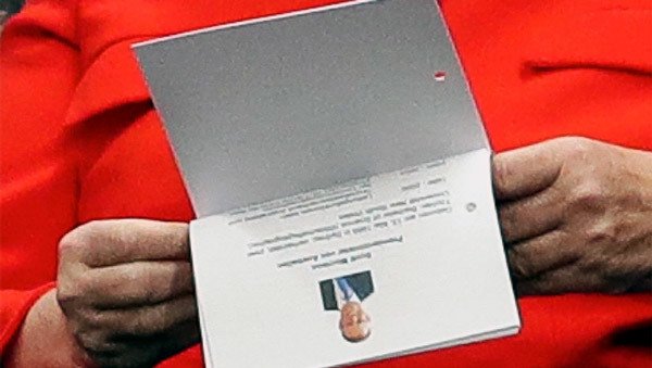Theo hãng thông Sputnik, bà Merkel bị "bắt quả tang" đang đọc lại tập ghi chú về ông Morrison ngay trước khi hai nguyên thủ bắt đầu hội đàm.