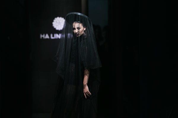 Trong show thời trang tối 1/12, Hồng Quế hoá cô dâu ma khi làm vedette. Trông đầy ma mị nhưng rất ấn tượng. Trên sàn diễn Việt, người mẫu mặc trong suốt.
