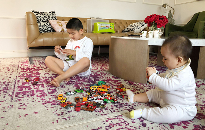 Phòng khách không chỉ là nơi để vợ chồng Hồng Nhung đón tiếp bạn bè mà còn trở thành chỗ để hai con của cô chơi đùa. Cậu bé Skyler rất hòa đồng với em gái cùng mẹ khác cha Sukem.