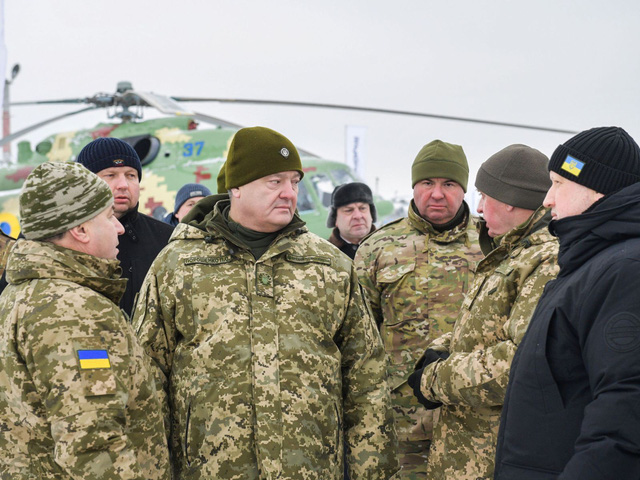 Tổng thống Ukraine Poroshenko (thứ hai từ trái sang) và Bộ trưởng Quốc phòng Ukraine Stepan Poltorak (ngoài cùng bên trái) thăm một căn cứ quân sự vào cuối tuần trước. (Ảnh: Sky)