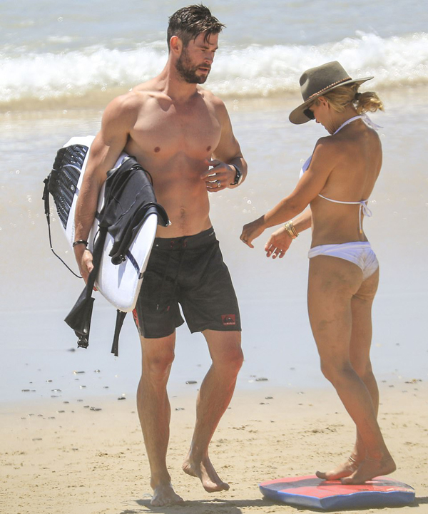 Chris Hemsworth và bà xã Elsa Pataky thư giãn trên bãi biển Byron vào sáng thứ hai. Chris gây chú ý với thân hình cường tráng, cơ bụng sáu múi trong khi vợ anh cũng sở hữu vóc dáng săn chắc không kém.
