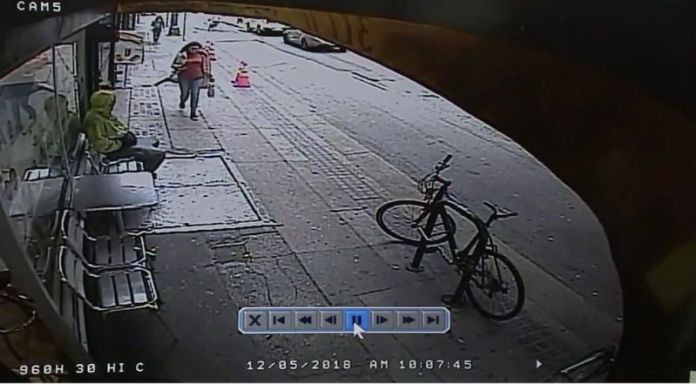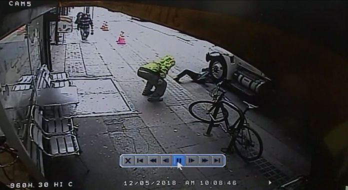 Nạn nhân vô tình đi ngang qua, nghi can đứng dậy xô xuống đường. (Hình: ABC 7)