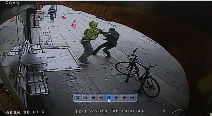 Khi người đàn ông này đến gần, nghi can bất ngờ đứng dậy, nhảy tới và xô mạnh ông ta ngã sóng xoài ra đường.