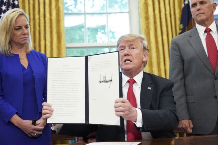 TT Donald Trump ký sắc lệnh di trú tại Tòa Bạch Ốc ngày 20 Tháng Sáu năm 2018. (Hình: Mandel Ngan/AFP/Getty Images)