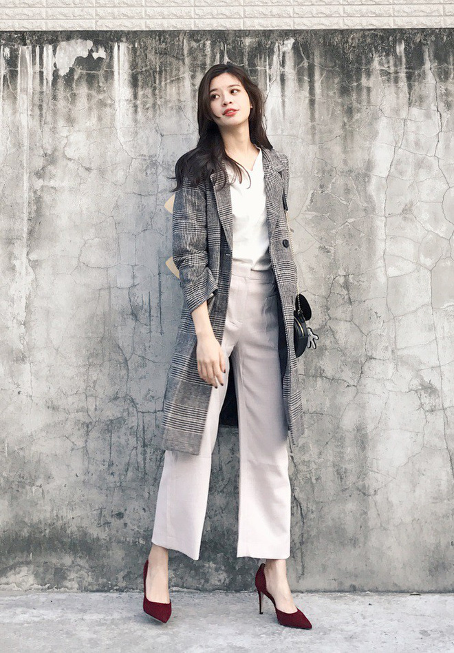 Thay vì kết hợp áo dáng dài với quần jean, bạn có thể kết hợp nó với quần âu. Nếu yêu thích phong cách thanh lịch, chững chạc thì quần âu ống suông dài sẽ là lựa chọn hợp lý hơn cả còn những chiếc quần âu ống lửng sẽ thích hợp với những quý cô trẻ trung năng động, đặc biệt quần âu ống lửng kết hợp cùng ankle boots sẽ giúp cho set đồ với áo khoác dáng dài trở nên nổi bật và sành điệu.