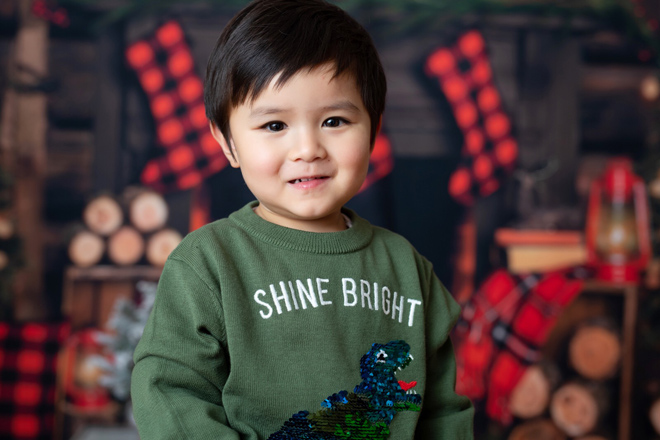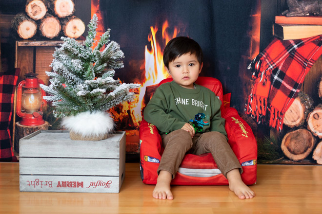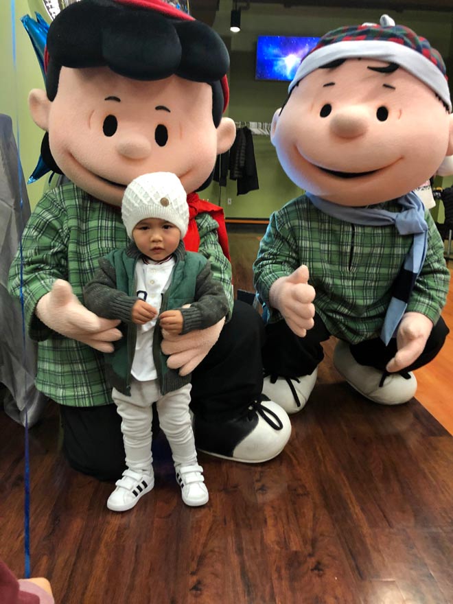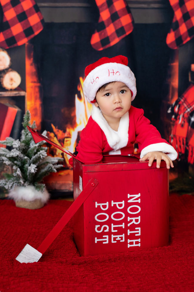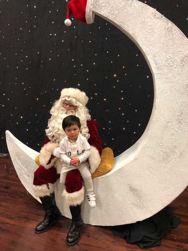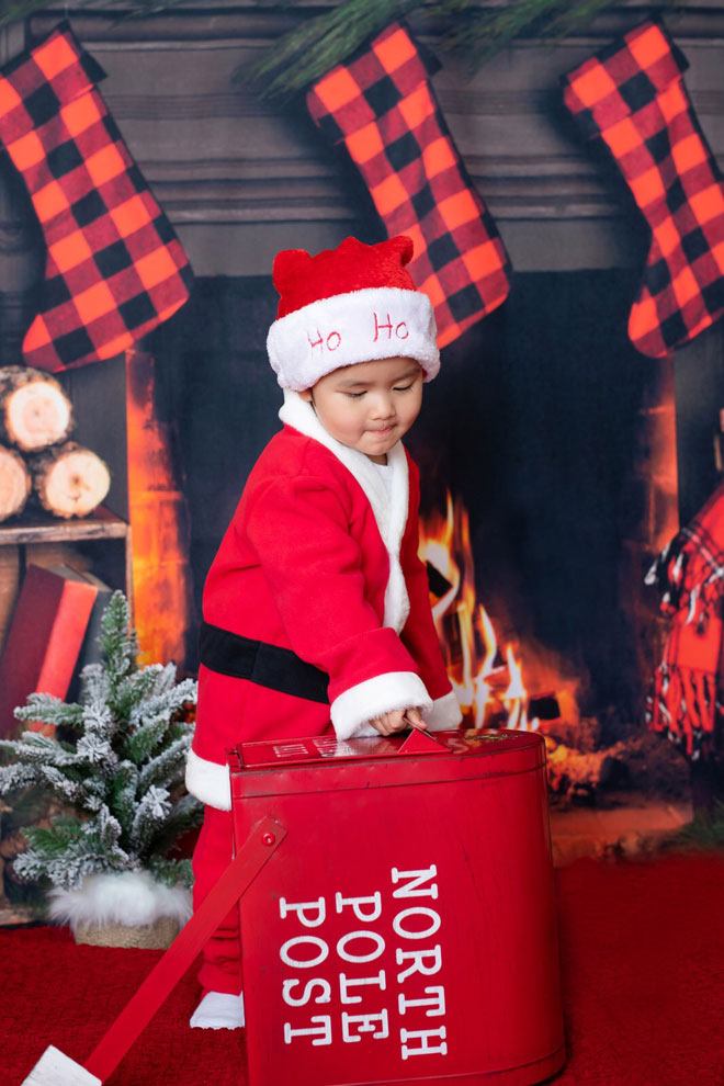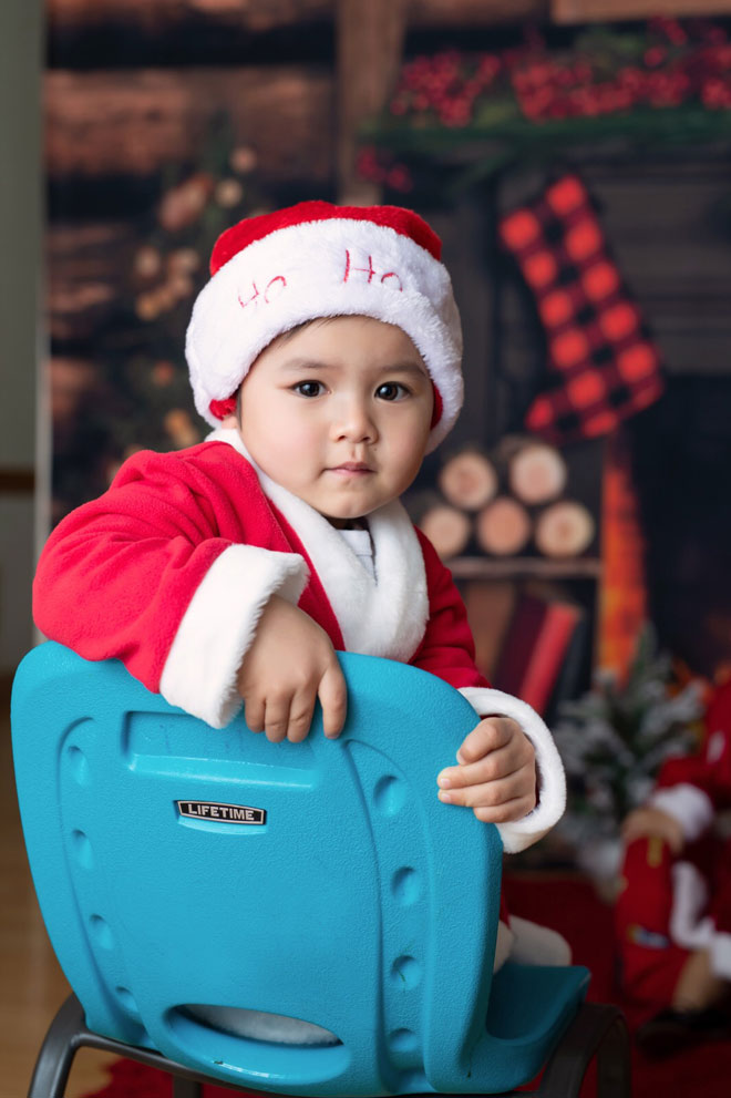 Thiên Từ mới hơn 1 tuổi rưỡi nhưng đã rất ra dáng "thanh niên". Cậu bé có gương mặt bụ bẫm đáng yêu, được mẹ cho mặc bộ quần áo ông già Noel chụp hình trong bối cảnh trang trí Giáng sinh.