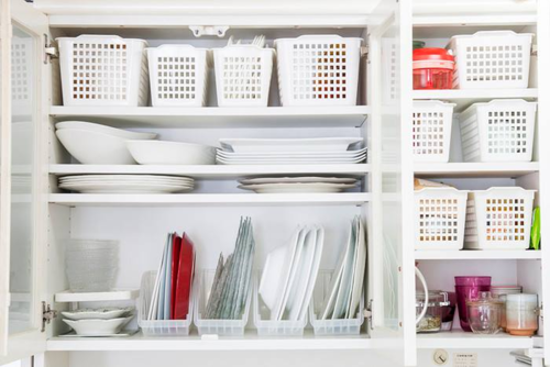 Trong tủ bếp, xếp đồ theo chiều dọc sẽ tối ưu hóa không gian của bạn. Các loại đồ dùng như giỏ nhựa sâu lòng có thể giúp tăng đáng kể không gian tủ bếp.