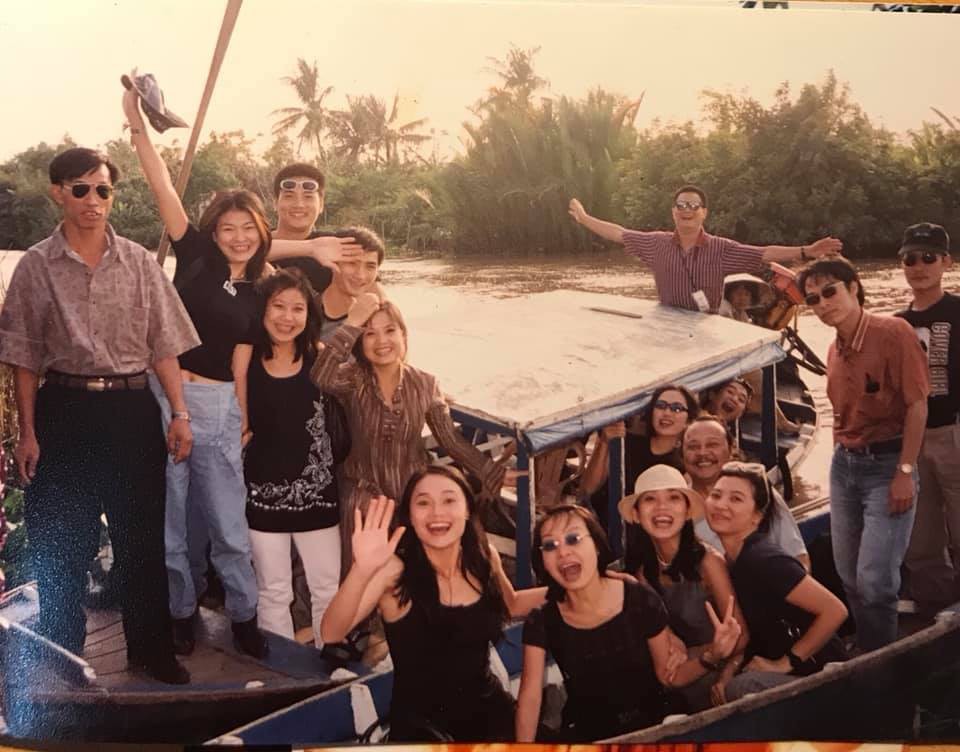 Nghệ sĩ Anh Tú (đứng giang tay) và diễn viên Quách Thu Phương (váy đen hàng đầu) cùng các nghệ sĩ, diễn viên Nhà hát Tuổi trẻ trong đợt lưu diễn cùng nhau.