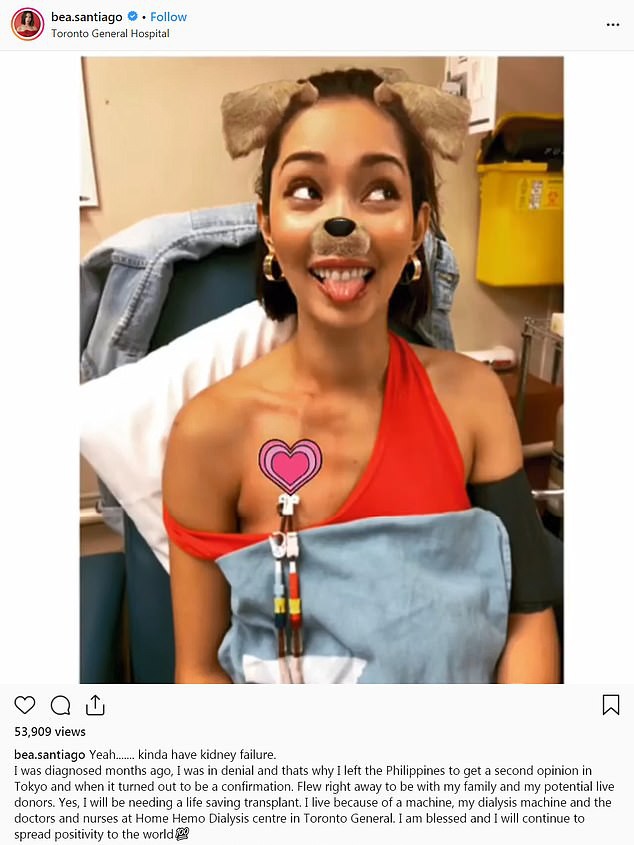 Bea Rose Santiago, Hoa hậu Quốc tế 2013 mới đây tiết lộ cô bị chẩn đoán suy thận mãn tính hồi tháng 8/2018. Kể từ đó cô tiếp nhận điều trị và chạy thận liên tục. Santiago cho biết, cô cần ghép thận để giữ mạng sống.