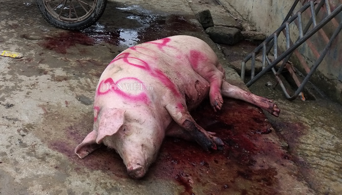 Một con lợn bị long móng, xuất huyết nằm liệt bên ngoài chuồng được các lái buôn khênh lên xe đưa đi bán.