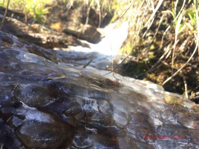 Đến thời điểm hiện tại, nhiệt độ tăng lên dưới 10 độ làm tan dần lớp băng nhưng vẫn còn lại lớp băng mỏng xen kẽ những khoảng đá và cây cỏ khiến nhiều người thích thú, báo VTC News đưa tin.
