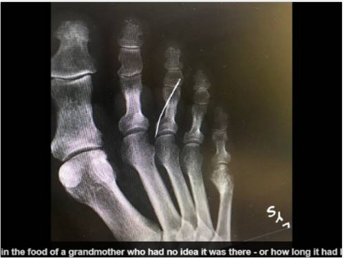 Ảnh chụp X-quang cho thấy kim khâu nằm trong chân cụ bà người Mỹ ẢNH CHỤP MÀN HÌNH DAILY MAIL