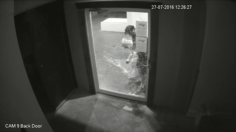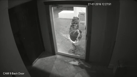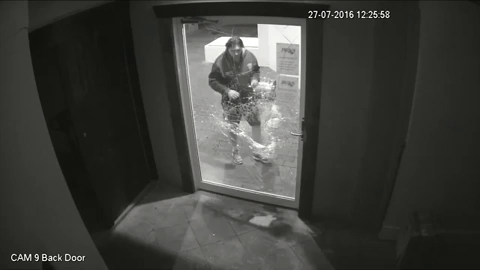 Qua nhiều lần bê thùng rồi ném chiếc thùng vào tấm cửa kính, kẻ đột nhập cũng chỉ tạo ra được một lỗ thủng khá nhỏ, không đủ cho hắn chui qua.