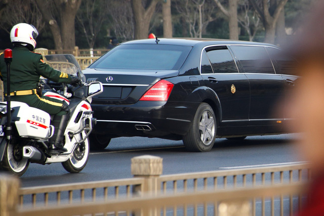 Một xe limousine màu đen gắn huy hiệu vàng đã di chuyển cùng đoàn xe hộ tống qua trung tâm thủ đô Bắc Kinh hôm nay 9/1. Chiếc xe được cho là chở nhà lãnh đạo Triều Tiên Kim Jong-un.