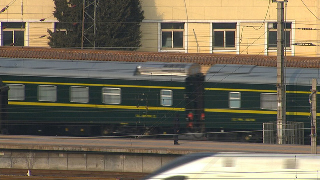 Đoàn tàu đặc biệt sơn màu xanh với sọc kẻ vàng đưa nhà lãnh đạo Kim Jong-un từ Bắc Kinh trở về Triều Tiên. Đây là chuyến thăm thứ 4 của ông Kim Jong-un tới Trung Quốc kể từ khi lên nắm quyền vào cuối năm 2011.