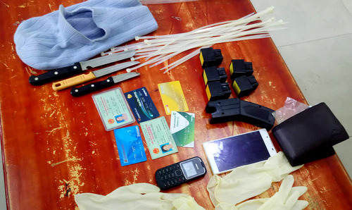Súng điện, dao, găng tay… nghi can dùng để cướp. (Ảnh: Quang Bình/*********)