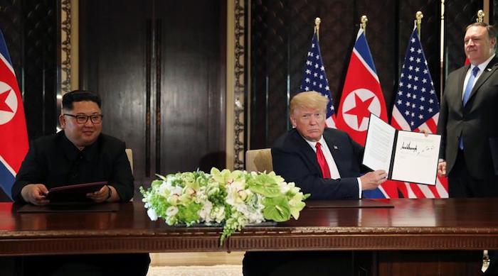 Tổng thống Donald Trump đưa ra tài liệu cho thấy ông và lãnh đạo Triều Tiên Kim Jong Un đã ký kết thừa nhận tiến trình đàm phán và cam kết sẽ tiếp tục, sau hội nghị thượng đỉnh của họ năm 2018. (Ảnh: Reuters)