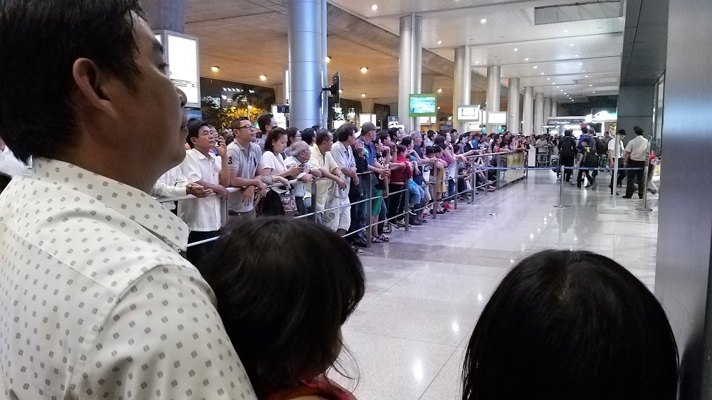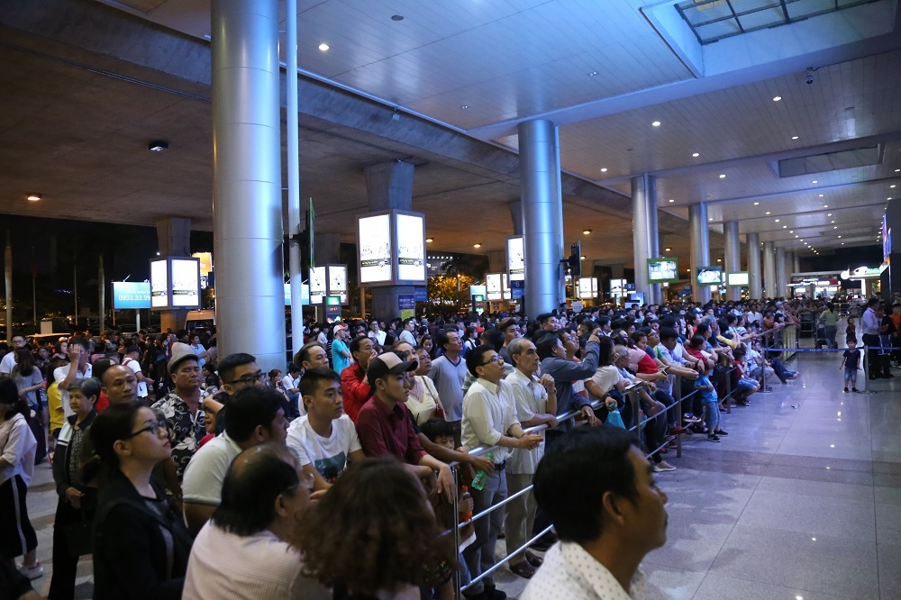 Càng về khuya, lượng người đổ về sân bay Tân Sơn Nhất đông bất thường. Có nhiều trường hợp, một gia đình 10 người đến đón 1 người. Nhiều người cố gắng đứng lên cao để hóng người thân.