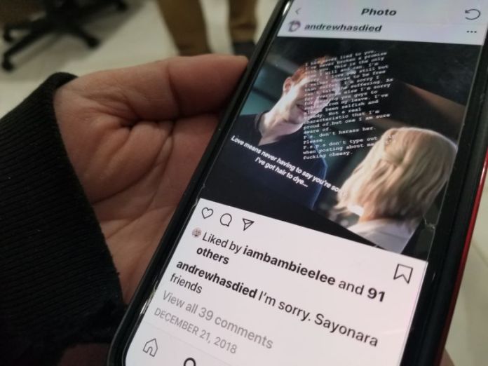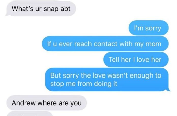 Dòng tin nhắn cuối cùng của Andrew viết, “Mình chưa bao giờ nói dối bạn. Mình chưa bao giờ thất hứa với bạn. Đây là lần duy nhất. Mình xin lỗi. Mình vẫn thương bạn nhưng mình thà chọn được tự do hơn là đau khổ. Mình xin lỗi, mình không thể chịu đựng sự đau khổ nữa. Với những bạn bè khác, mình xin lỗi đã làm các bạn đau buồn vì sự ra đi của mình. Mình tham lam và ích kỷ quá, dù đó không phải là tính cách mà mình tự hào…”