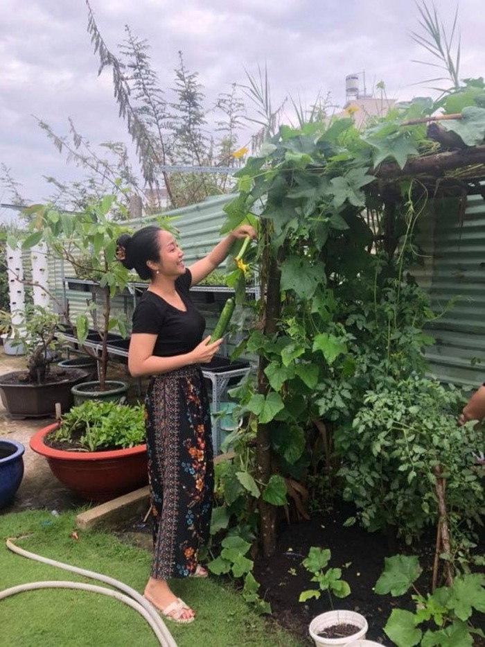 Nàng MC chia sẻ rằng mình hoàn toàn yên tâm khi có chồng và chú quản gia, chú giúp việc chăm sóc dùm vườn rau sạch.