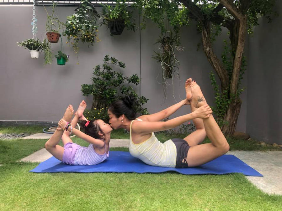 Đây còn là không gian để nữ MC tập yoga cùng con