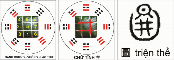 Khi gói, để bánh khỏi bị bể khi nấu, người ta có thể buộc nhiều dây, nhưng khi đem cúng, người xưa chỉ để có 4 dây mà thôi. Bốn dây này làm thành cửu cung như h́nh minh họa; đồng thời c̣n vẽ ra trên ấy một con chữ có từ ngàn xưa mà hầu như ít ai quan tâm, chỉ có những người làm ra nó mới biết sự liên quan giữa cái bánh và con chữ chỉ nguồn gốc dịch học, mà cũng là nguồn gốc chữ vuông của người Việt mà thôi, đó là chữ Tỉnh井, nghĩa là cái giếng. Chữ Tỉnh 井tượng trưng cho Lạc thư – Hậu thiên Bát quái, tức Thái cực, v́ người Việt là người Nam thuộc Thái cực – Dương. Chính v́ vậy mà tiền nhân nước Việt đă viết truyền thuyết Việt Tỉnh Cương, thường dịch là Giếng Việt. Lạc Thư được sinh ra từ Hà Đồ, v́ vậy ta thấy trong chữ Đồ圖 triện thể có chữ Tỉnh井.