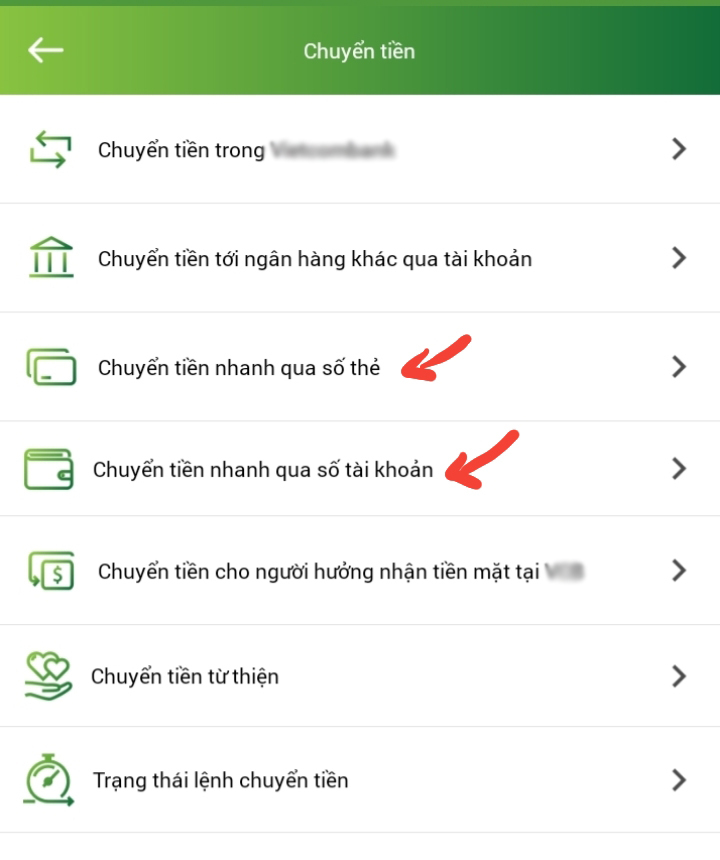 Lúc này, người dùng sẽ có 2 tùy chọn là chuyển tiền nhanh qua số tài khoản và chuyển tiền nhanh qua số thẻ.