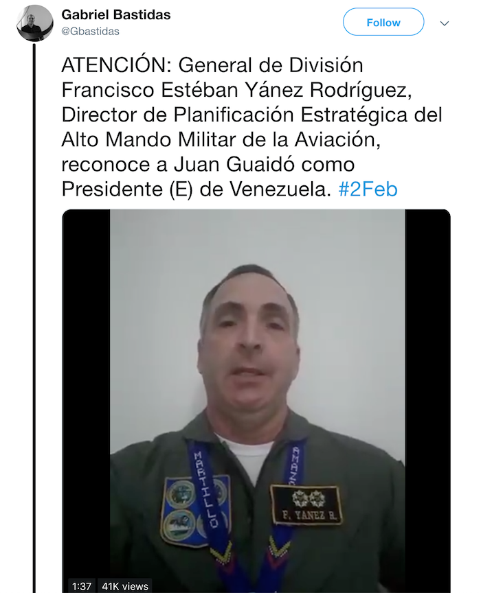 Trong đoạn video công bố trên Twitter hôm thứ Bảy (2/2), Tướng Francisco Yanez, một thành viên của bộ chỉ huy cấp cao thuộc Không quân Venezuela, đã kêu gọi các thành viên khác cùng rời bỏ chính quyền Maduro.