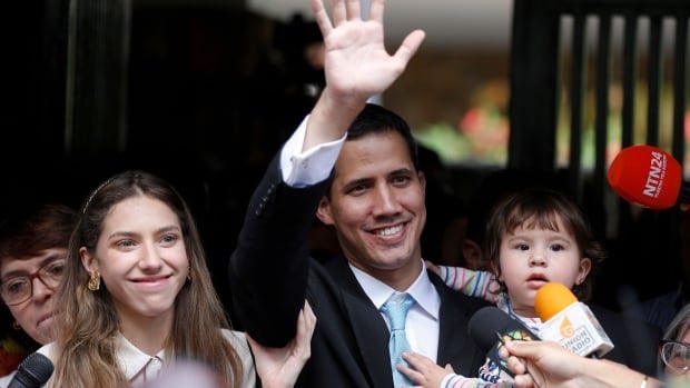 Chủ tịch Quốc hội Venezuela kiêm tổng thống lâm thời được nhiều nước ủng hộ, ông Juan Guaido vẫy tay với những người ủng hộ, trong khi đứng cạnh vợ và bế con gái 20 tháng tuổi (Ảnh: Twitter)