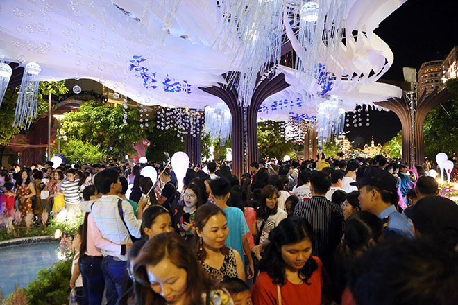 Việc di chuyển trên đường hoa khá khó khăn do lượng người đổ về thưởng lãm đông. “Biết là đường hoa trong ngày khai mạc rất đông nhưng tôi vẫn thích đến để tham quan, chụp ảnh. So với những năm trước, đường hoa năm nay trang trí đẹp mắt, nhiều tiểu cảnh kết hợp với ánh sáng đẹp lung linh”, chị Lê Thị Linh ngụ quận Bình Tân chia sẻ.