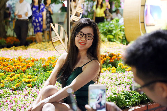 Để chụp được các tiểu cảnh trên đường hoa nhiều người phải chờ đợi. “Tuy khó khăn chụp ảnh vì lượng người đông nhưng tôi vẫn thấy vui vì có không khí Tết. Dạo một vòng tôi thấy đường hoa năm nay thiết kế ấn tượng và rất sinh động”, chị Nguyễn Thị Luyến, ngụ quận 3 cho biết.